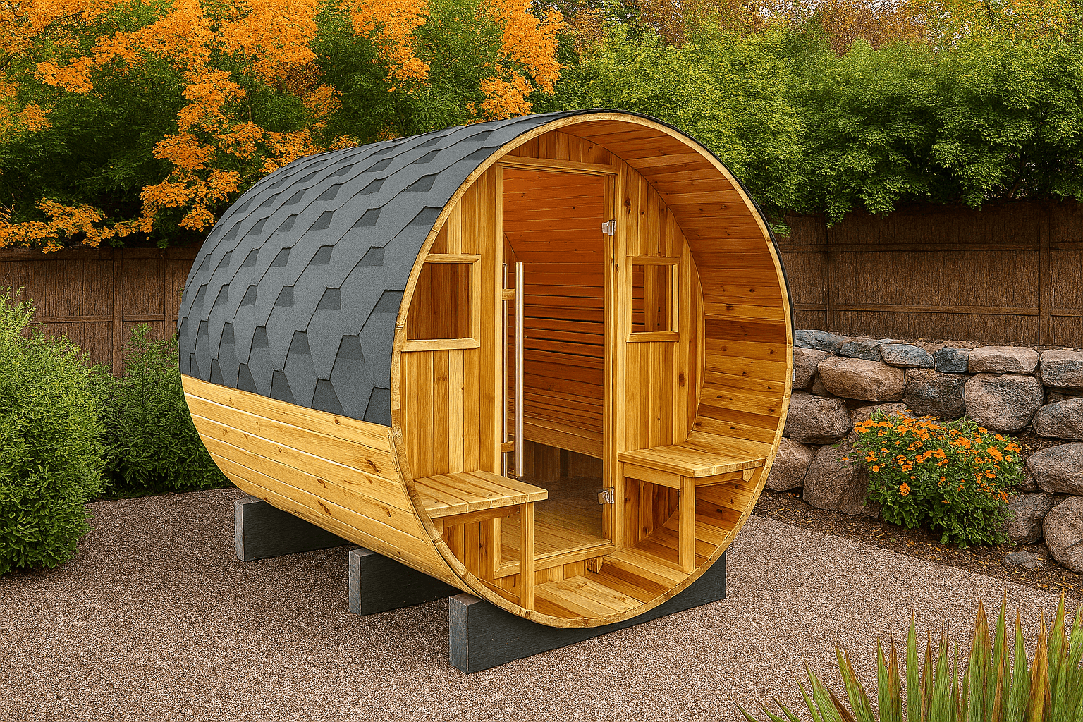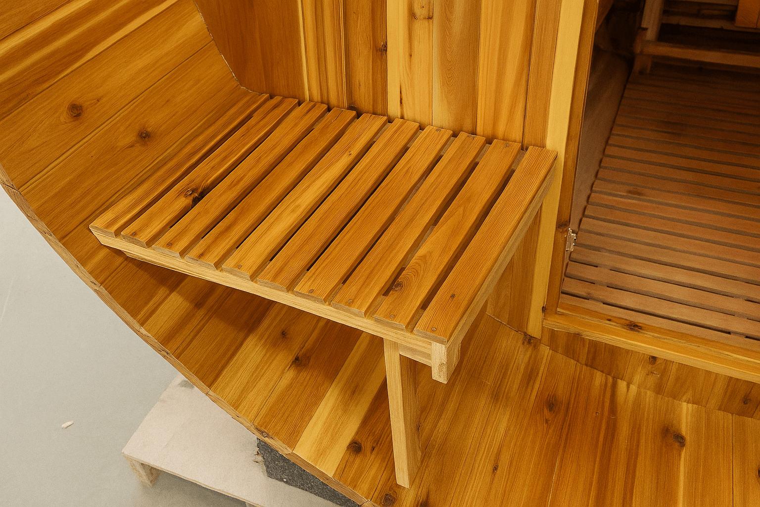 The Oasis Outdoor Barrel Sauna blends timeless barrel design with thoughtful modern touches for a premium home spa. Built from 1⅜″ solid red cedar with precision ball-and-socket joinery, it’s engineered for year-round durability and beauty. A canopy-style roof with exterior benches creates shaded, social space pre- or post-sauna, while dual full-length benches with ergonomic backrests seat 2–4 adults comfortably inside. Powered by a 6 kW Harvia heater with stones, Oasis heats quickly and evenly to ~170°F, and a programmable delay timer lets you schedule sessions up to 8 hours in advance.