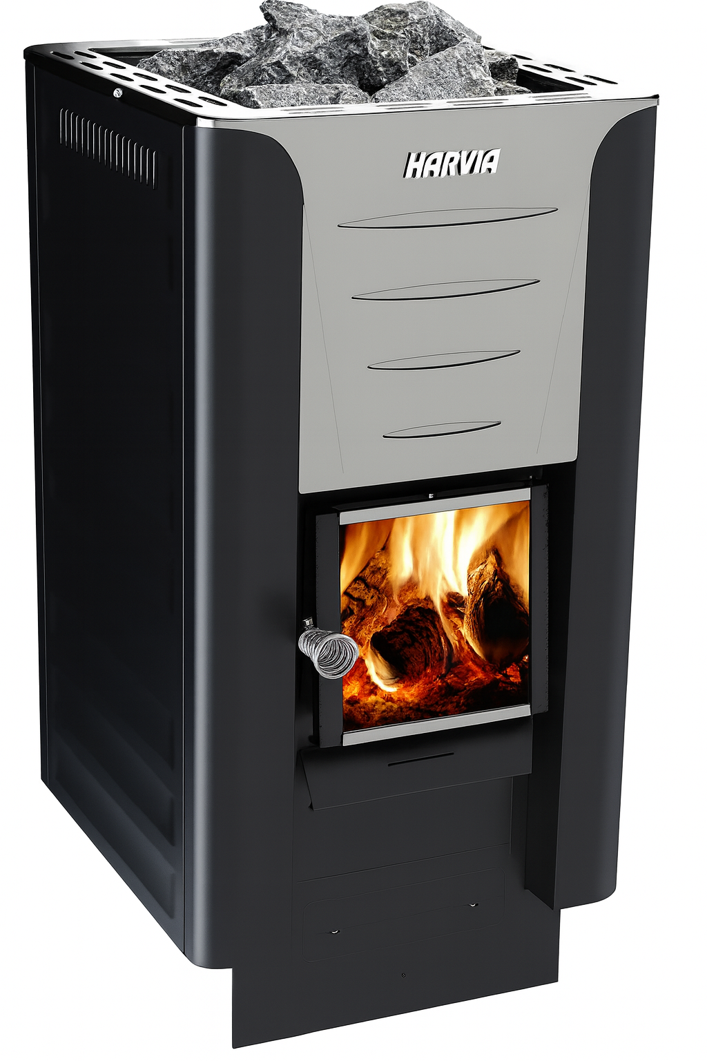 The Harvia 26 Pro (WKPR26M) features a graphite-black steel finish, cast-iron framed glass door, and adjustable legs for easy leveling. Clean-burning engineering delivers rich steam and efficient, even heat for sauna rooms 353–918 cu. ft. (10–26 m³).