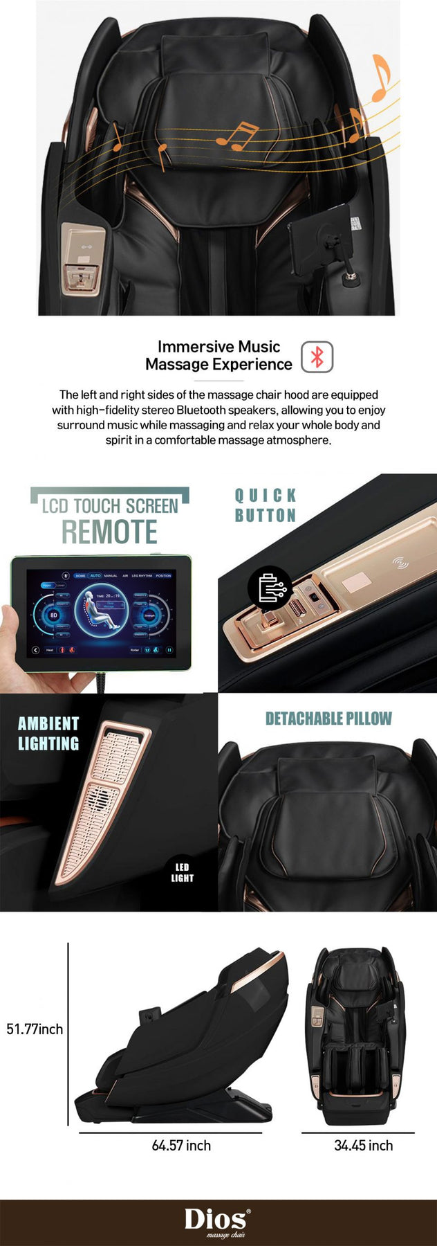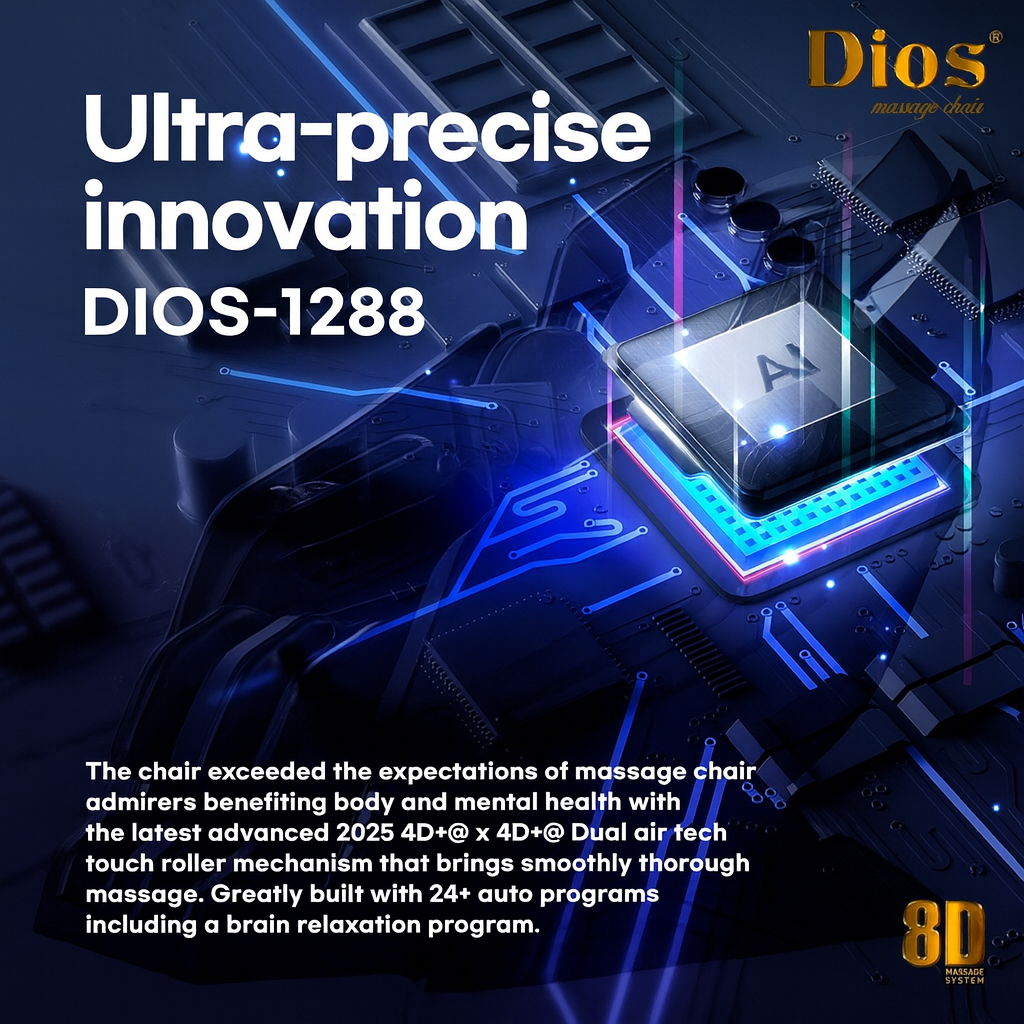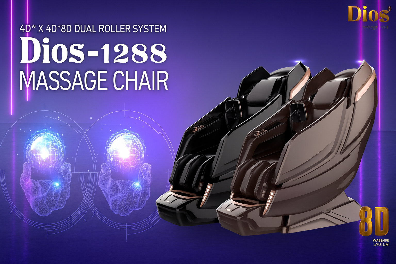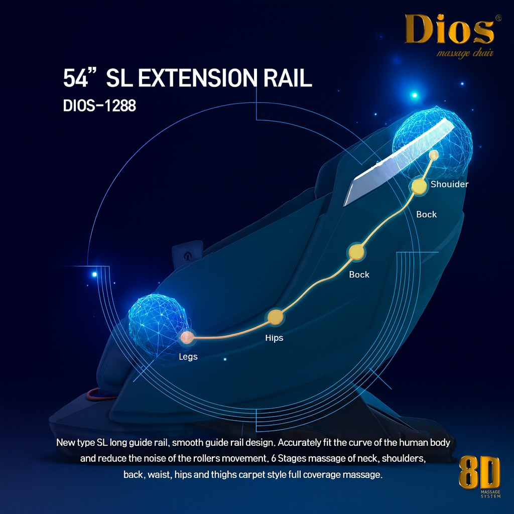 The Dios 1288 Massage Chair combines cutting-edge 8D massage technology, a 54" SL-track, and multiple control options for a fully customized relaxation experience. Built for comfort, innovation, and modern aesthetics, it fits seamlessly into home gyms, wellness rooms, or luxury living spaces. From soothing kneading to deep-tissue intensity, the Dios 1288 adapts to your body for spa-level results at home.