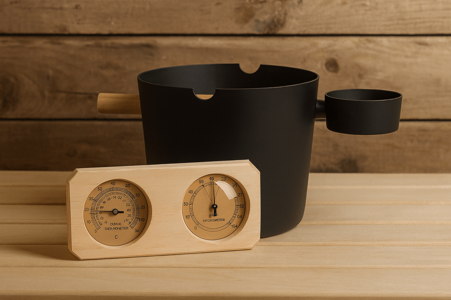 This all-in-one kit is perfect for sauna enthusiasts seeking quality, style, and ease of use. Whether ladling water for steam or monitoring heat and humidity, the set is thoughtfully designed to elevate your sauna ritual with premium materials and Nordic flair.