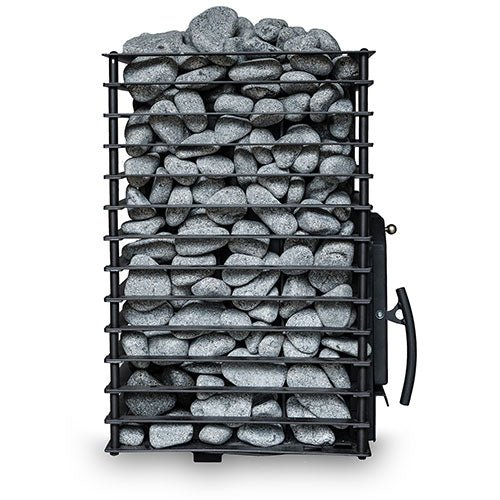 Use natural, angular sauna stones such as olivine or peridotite in the 10 to 15 cm range. Avoid river rocks or decorative stones. Consider an extra box of stones so you can hand-select shapes that promote good airflow and even heating.