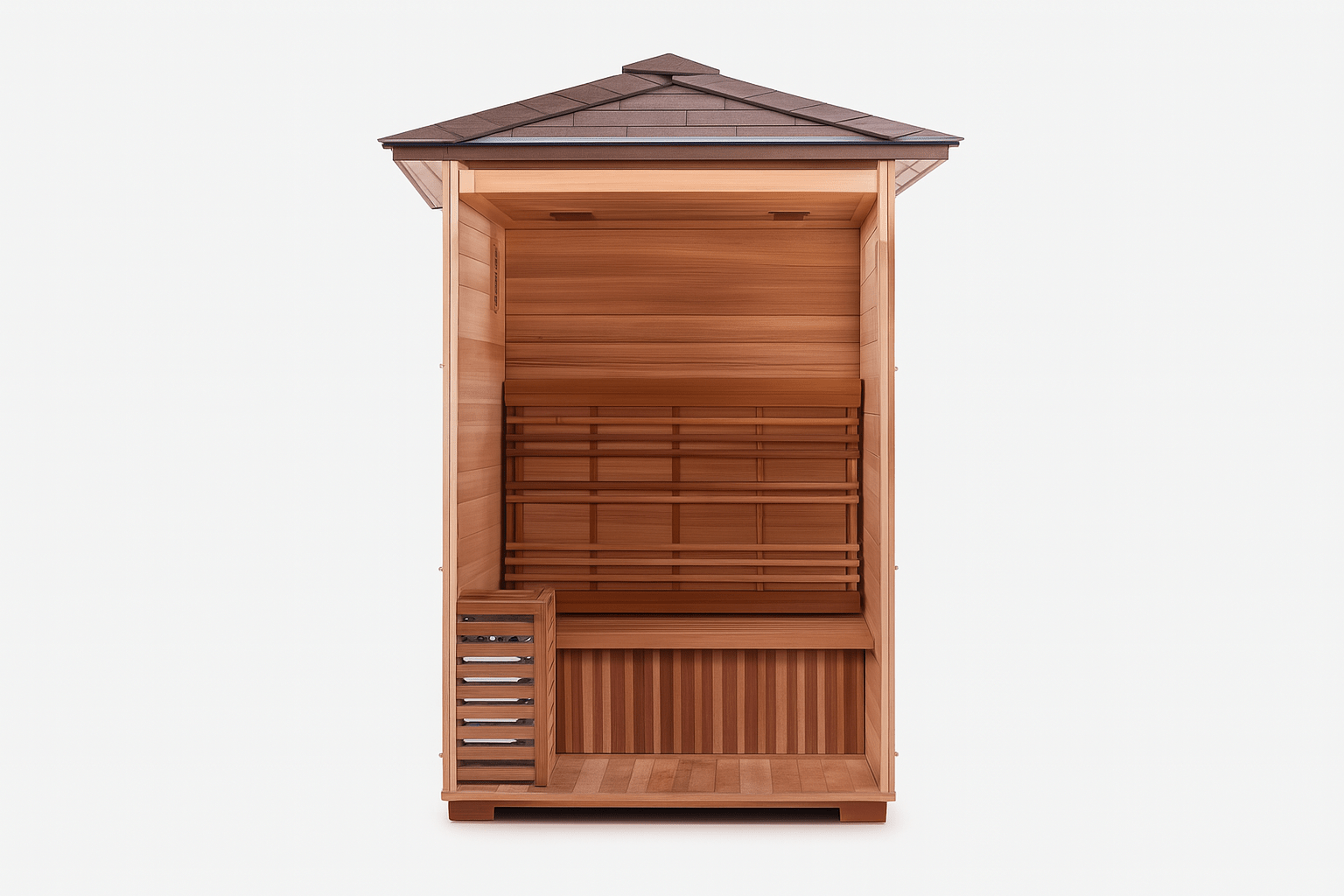 The Eagle 2-Person Outdoor Traditional Sauna is crafted from aged Canadian hemlock with double-pane insulated walls and a weather-resistant shingled roof for true four-season performance. A Harvia® 4.5 kW electric heater delivers fast, even heat, while Bluetooth® audio and chromotherapy LED lighting create a calming, spa-like atmosphere. Sized for patios, decks, and garden retreats, Eagle blends classic sauna craftsmanship with modern convenience for a refined backyard wellness experience.