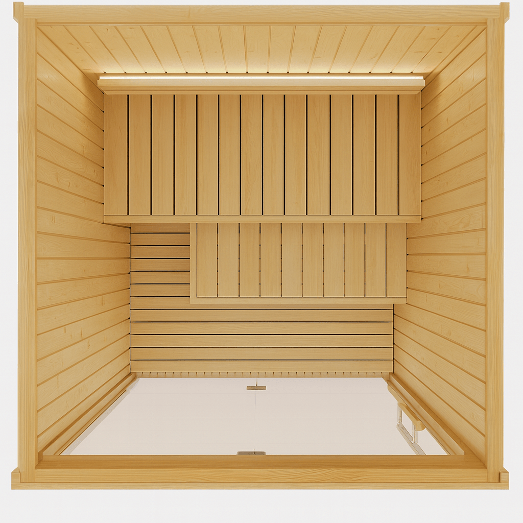 The SaunaLife Model X2 is a luxury indoor sauna kit handcrafted in Northern Europe from Grade-A Aspen with Nordic Spruce accents. Compact and prefabricated for easy, same-day installation, it features a sleek tempered-glass wall, soft indirect LED lighting, and ergonomic seating for two—delivering modern Scandinavian comfort in a space-efficient footprint.